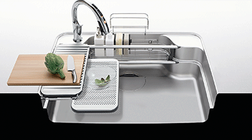 通过两层金属架以及两个托盘,我们可以提高准备材料,烹饪,以及清理厨余的效率以及物料的归整。容易造成污渍的环节可以在水槽中处理, 还可以使用中间板,用舒适的姿势清洗大型物品,如意大利面锅。